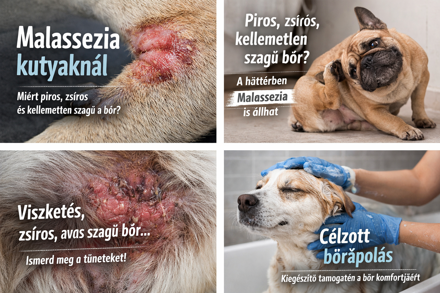 A Malasseziás bőrproblémáknál gyakori a piros, irritált bőr, a zsíros vagy tapadós tapintatú szőrzet, a kellemetlen, élesztős vagy avas szag, valamint a viszketés. Sok kutyánál hámlás, korpázás, sötétebbé váló bőrfelület és visszatérő fülproblémák is társulhatnak hozzá. A VCA leírása szerint az ilyen kutyák bőre gyakran zsíros, megvastagodott vagy sötétebb lehet, és az érintett területeken erős viszketés is jelentkezhet.